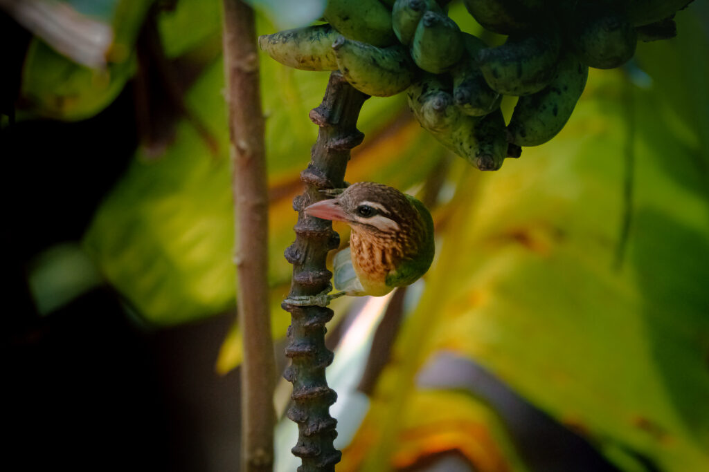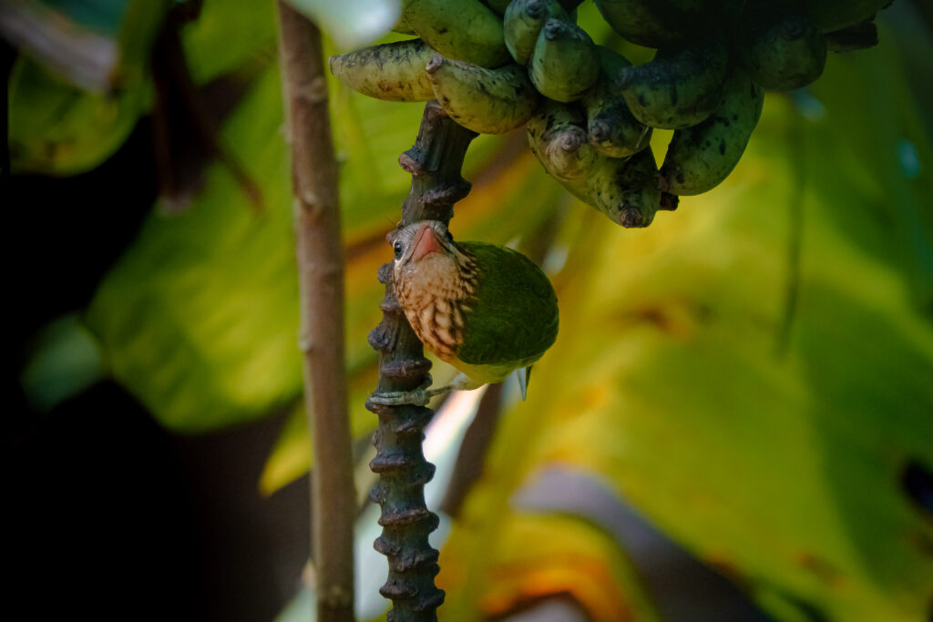 A small, vibrant bird perched comfortably on the banana bunch, completely unbothered by its surroundings. The White Cheeked Barbet had arrived, not just to visit, but clearly with a purpose.