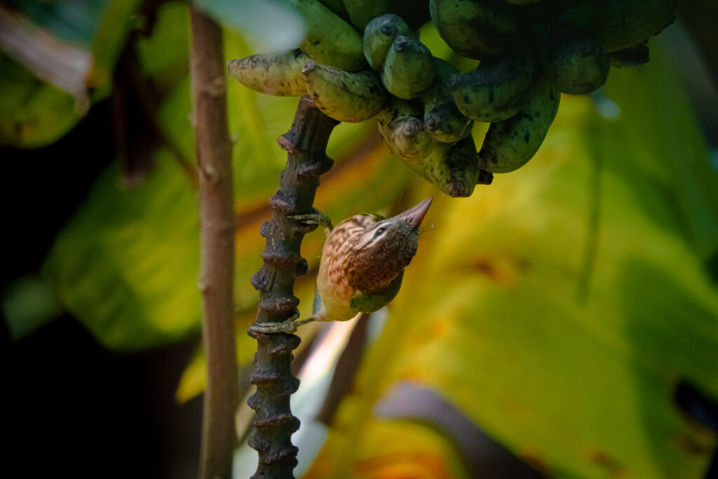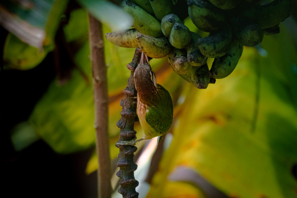 What struck me immediately was how fearless and focused the bird was. It wasn’t just pecking randomly, it was strategically eating. The barbet carefully positioned itself, gripping the stem with precision, and began carving into the bananas with its strong beak.